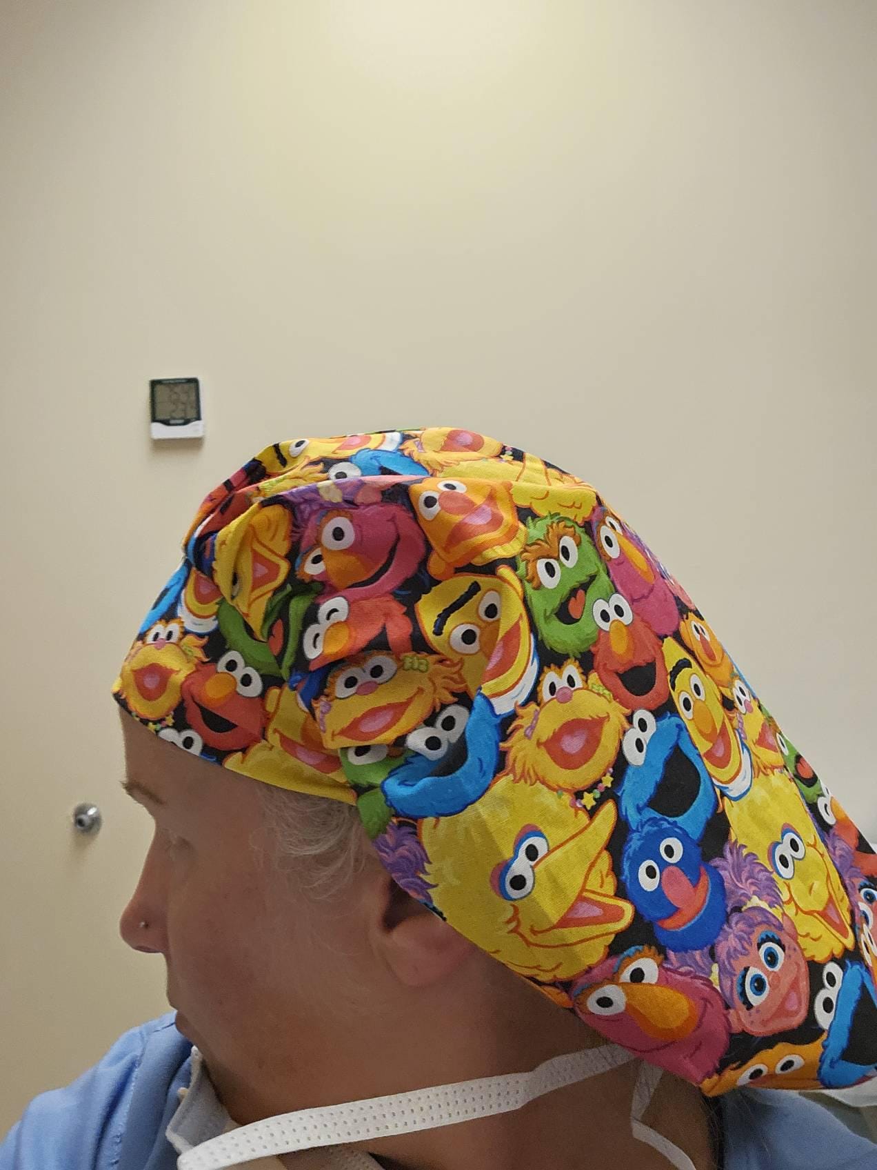 Scrub Caps Sesame Street characters on black fabric, with matching headband. NONE of the hats will be exactly the same as shown in photos due to pattern placement.