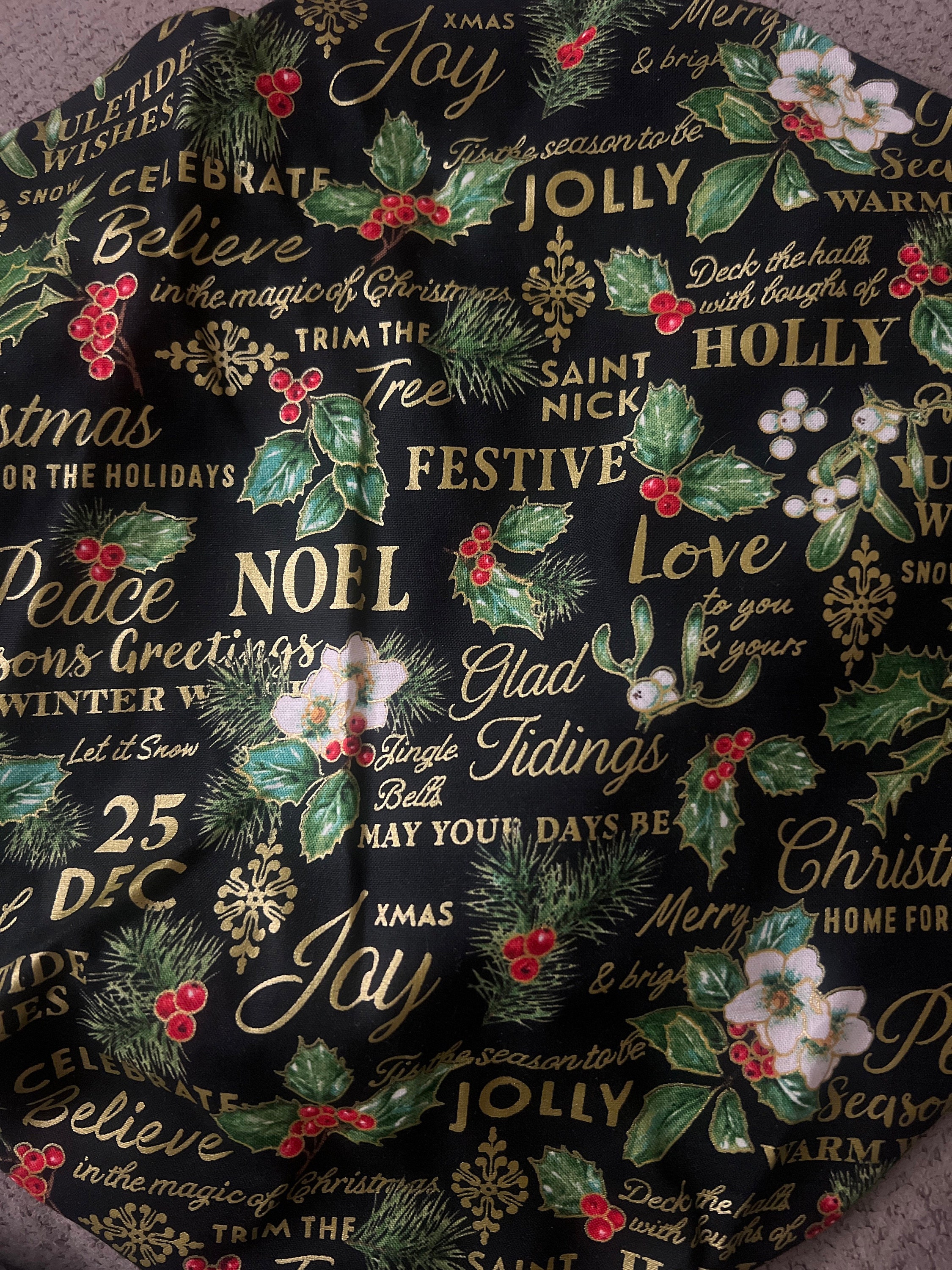 Scrub Caps Christmas Seasons Greetings black fabric tossed with Christmas seasonal words - Tis the Season to be Jolly, Deck the halls with boughs of Holly, Saint Nick and many more in gold with holly leaves and berries . Matching Headband, none of the hats will be identical to the photos as shown due to pattern placement.