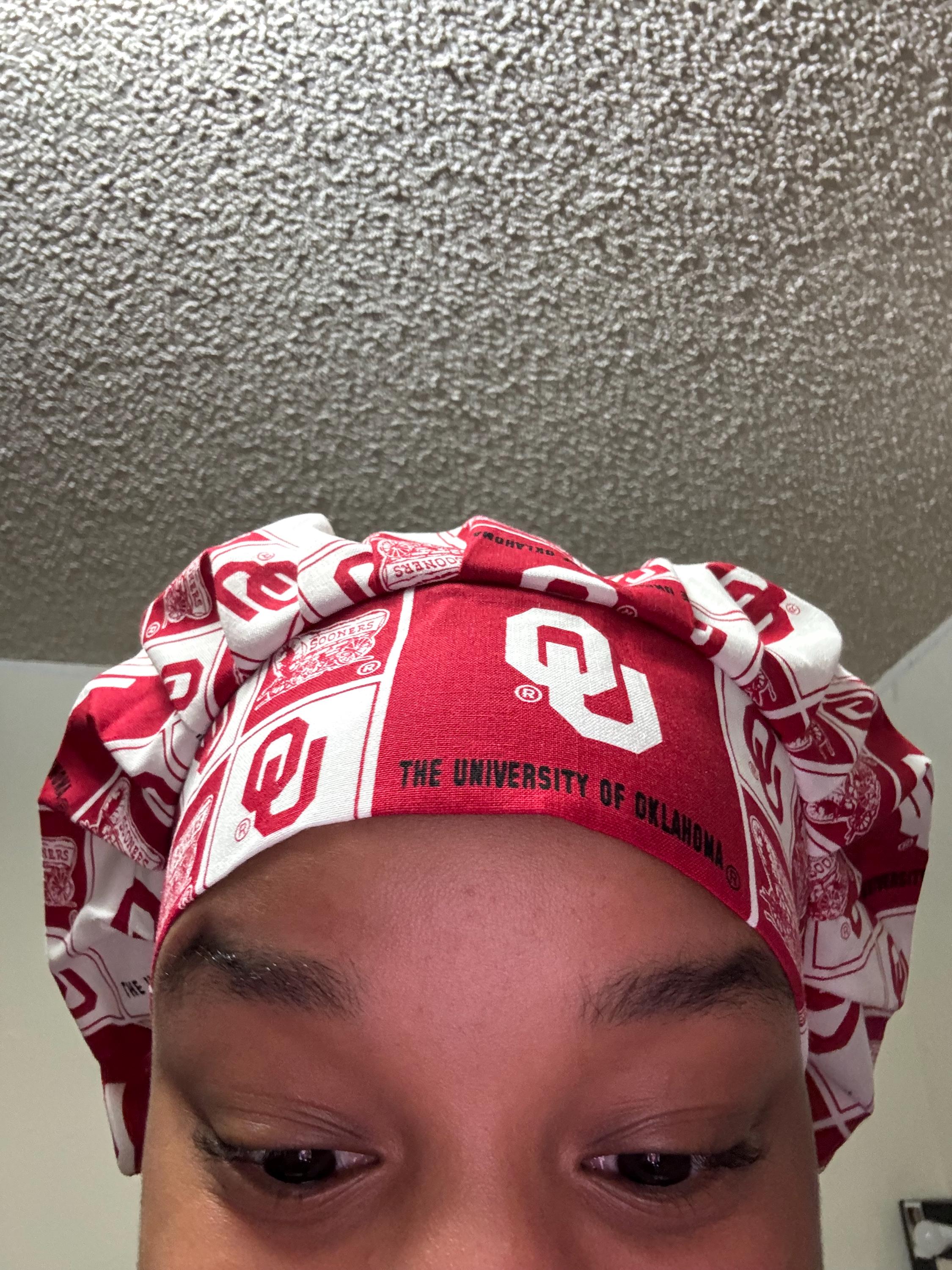 Scrub Hats University of Oklahoma fabric, "Sooners" block print cotton fabric. None of the headbands will be exactly the same as shown in photos due to pattern placement.