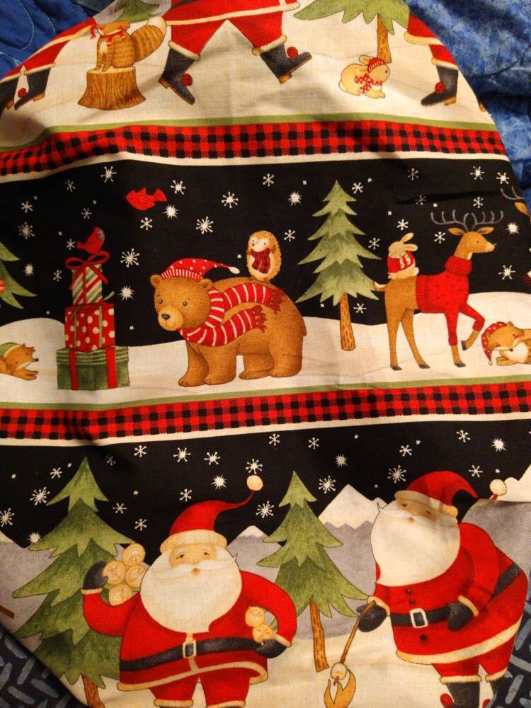 Scrub Caps Christmas Santa and Friends wide stripe fabric. Red, green and white Santa, presents, bears, foxes, trees, hedgehog and snowflakes in wide stripes on black fabric with coordinating red and green snowflake headband.