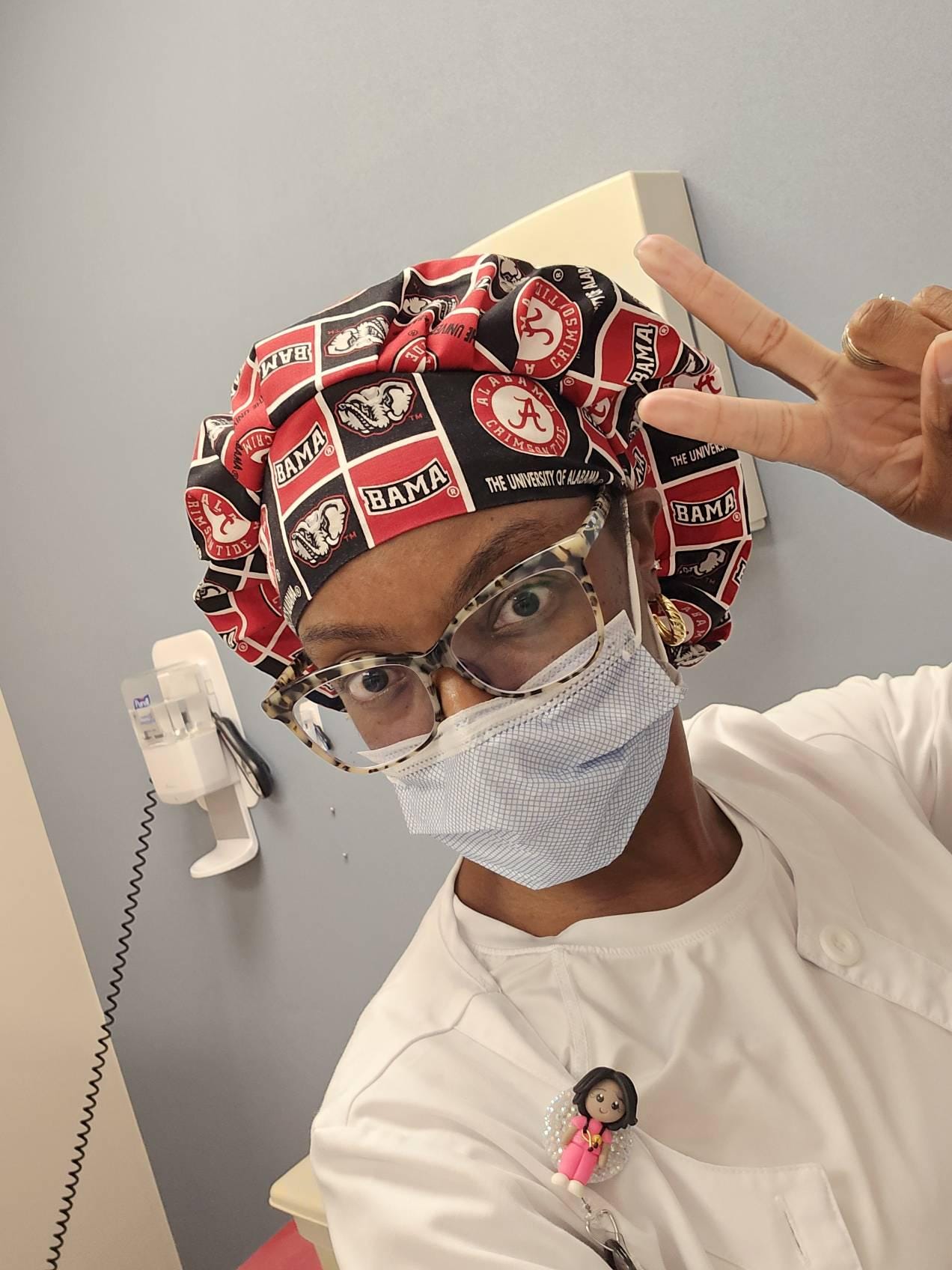 Scrub Caps University of Alabama Crimson Tide, Big Al block print fabric. None of the headbands will be exactly the same as shown in photos due to pattern placement.