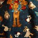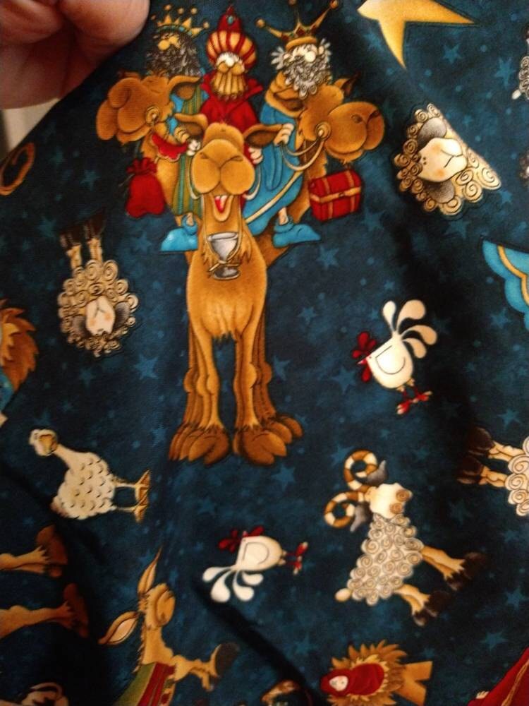 Scrub Caps Christmas Away in the Manger Fabric. Company calls it Navy fabric, I lean towards a dark teal/slate blue with Camels, Donkeys, Sheep, Chicken, Ducks, Angles, Sheppard, Baby Jesus and Mary, stars allover the background with coordinating ornaments headband.