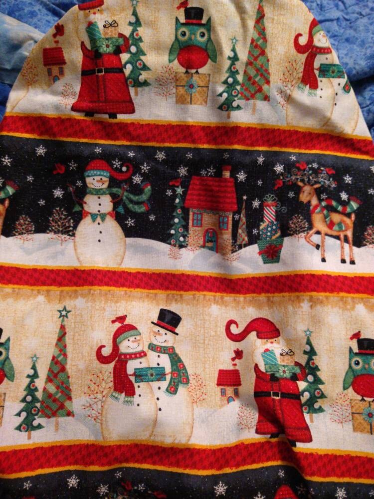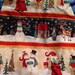 Scrub Caps Christmas Holly Jolly Christmas wide stripe fabric. Red, greens, cream, gold, tans, white Santa, owls, trees, snowmen, deer, snowflakes multi scene in wide stripes with coordinating black Christmas lights and snowflakes headband.