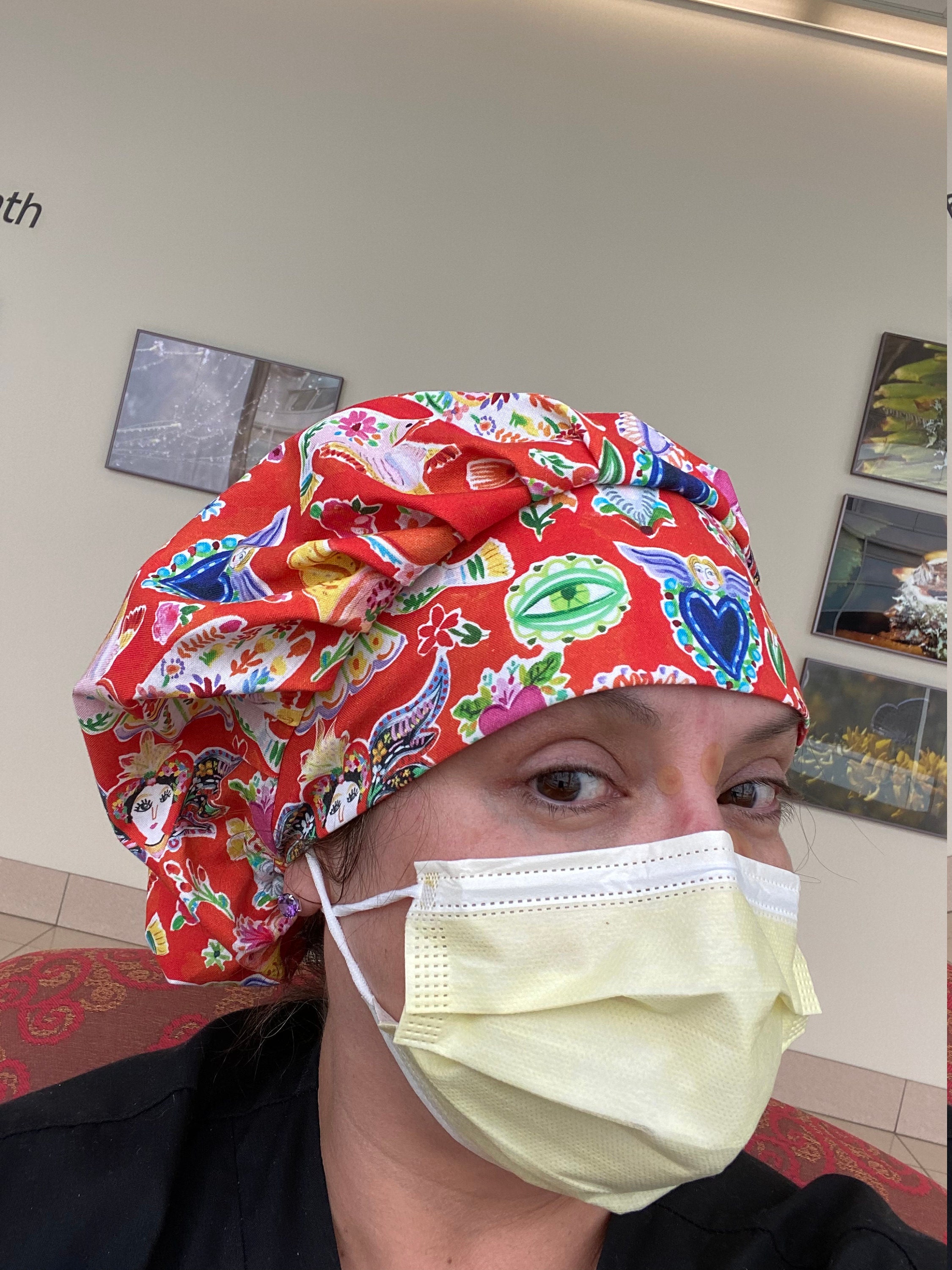 This hat is beautiful! The colors are even more vivid and bright in person and the designs are just as beautiful. I love the variety of hats that Kay makes and offers, that’s why I’ve been a customer of her‘s since 2009. I highly recommend ScrubHeads to everyone