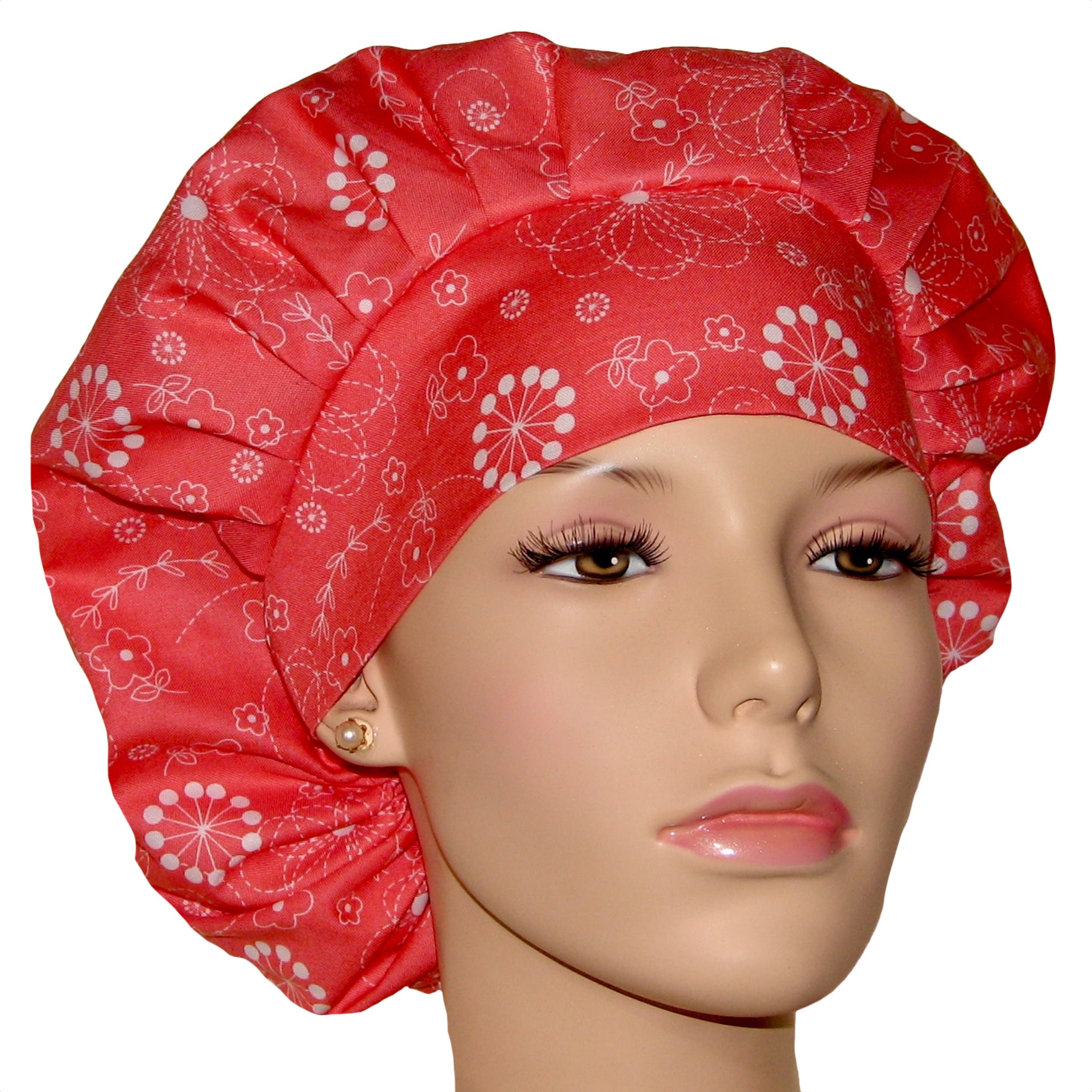 Scrub Hats Peachy Pink stitched doodle flowers fabric, peachy pink cotton fabric with floral print in white with matching headband. None of the headbands will be exactly the same due to pattern placement and your hat will not be identical to the photo shown. Picture #4 best representation of the color.